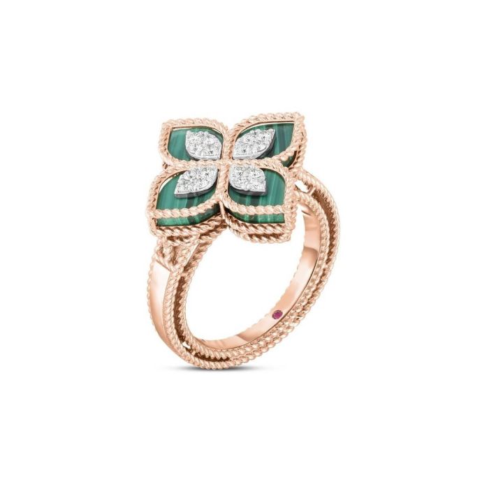 Pierścionek Roberto Coin Princess Flower różowe złoto diamenty Malachit rozmiar 13